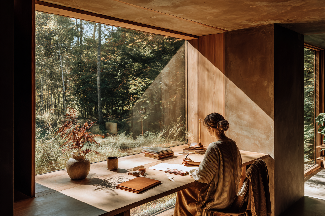 Woman with brown hair tied back, sitting at a wide wooden desk in a modern room with large windows, writing in a notebook. The desk has papers, books, a vase with dried flowers, and a candle. Outside, a forest scene with trees and sunlight.