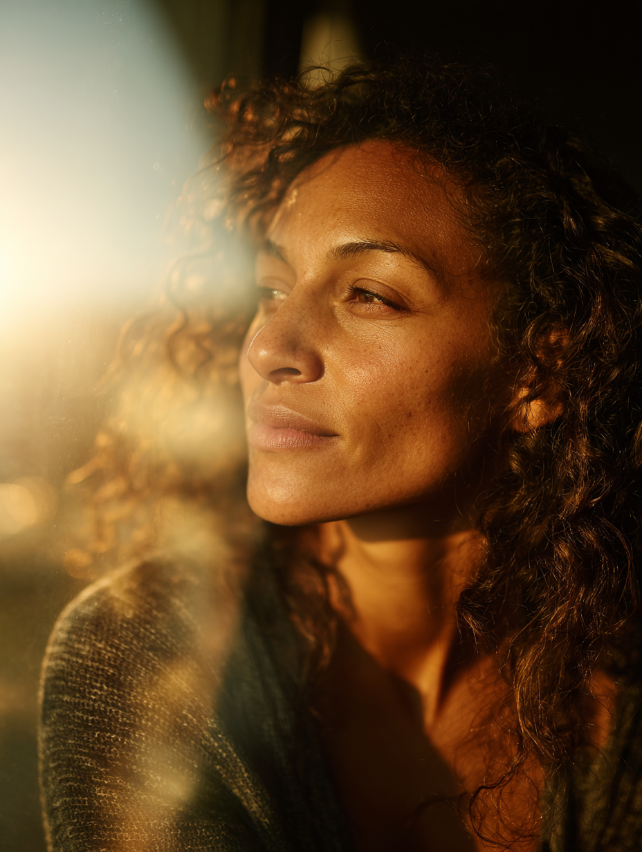 Close-up of a woman with curly hair gazing thoughtfully outdoors during sunset, soft golden lighting.